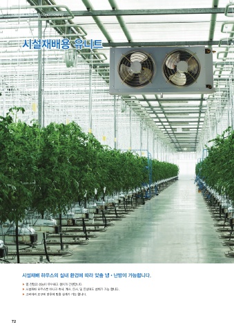 FAN COIL UNIT / AIR CONDITIONING 시설재배용 유니트 시설재배용 유니트 시설재배 하우스의 실내 환경에 따라 맞춤 냉•난방이 가능합니다. ▶ 열 전달의 성능이 우수하고 설치가 간편합니다. ▶ 시설재배 하우스뿐 아니라 축사, 계사, 돈사, 및 온실에도 설치가 가능 합니다. ▶ 소비자의 요구에 맞추어 맞춤 설계가 가능 합니다. 72