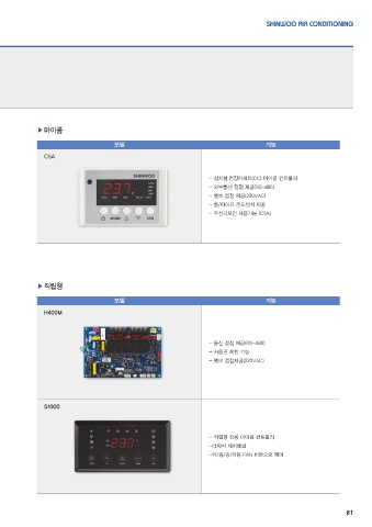 ▶마이콤 모델 기능 C5A - 상치형,천장카세트(CC) 마이콤 컨트롤러 - 외부통신 접점 제공(RS-485) - 밸브 접점 제공(220VAC) - 룸/파이프 온도센서 제공 - 무선리모컨 사용가능 (C5A) ▶직립형 모델 기능 H400M - 통신 접점 제공(RS-485) - 사용권 제한 기능 - 밸브 접점제공(220VAC) S1000 - 직립형 전용 마이콤 컨트롤러 -터치식 제어패널 -약/중/강/자동 FAN 버튼으로 제어 81