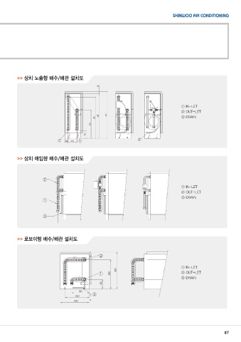 >> 상치 노출형 배수/배관 설치도 ڍڐ ① IN-LET ڝ ڜ ڜڝ ② OUT-LET ڐړڐ ڑڌڋ ③ DRAIN ڐڐڋ ڎڐڋ ڌڋڋ ڍ ڏڋ ڌڌڐ ڌ ڎ >> 상치 매입형 배수/배관 설치도 A ① IN-LET B ② OUT-LET ③ DRAIN 75 >> 로보이형 배수/배관 설치도 ① IN-LET ② OUT-LET ③ DRAIN [ B 87