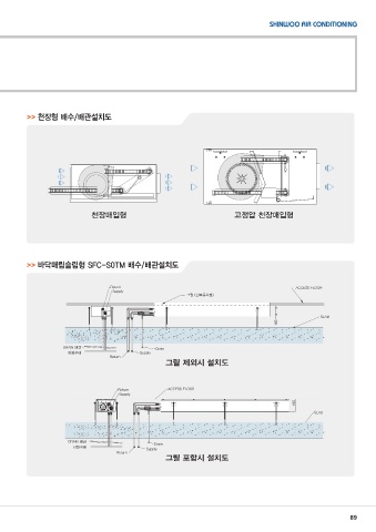 >> 천장형 배수/배관설치도 천장매입형 고정압 천장매입형 >> 바닥매립슬림형 SFC-S0TM 배수/배관설치도 Return ACCESS FLOOR Supply 그릴 (건축공사분) SLAB 165 DRAIN 배관 Drain 하향구배 Supply Return 그릴 제외시 설치도 Return ACCESS FLOOR Supply 195 SLAB DRAIN 배관 Drain 하향구배 Supply Return 그릴 포함시 설치도 89