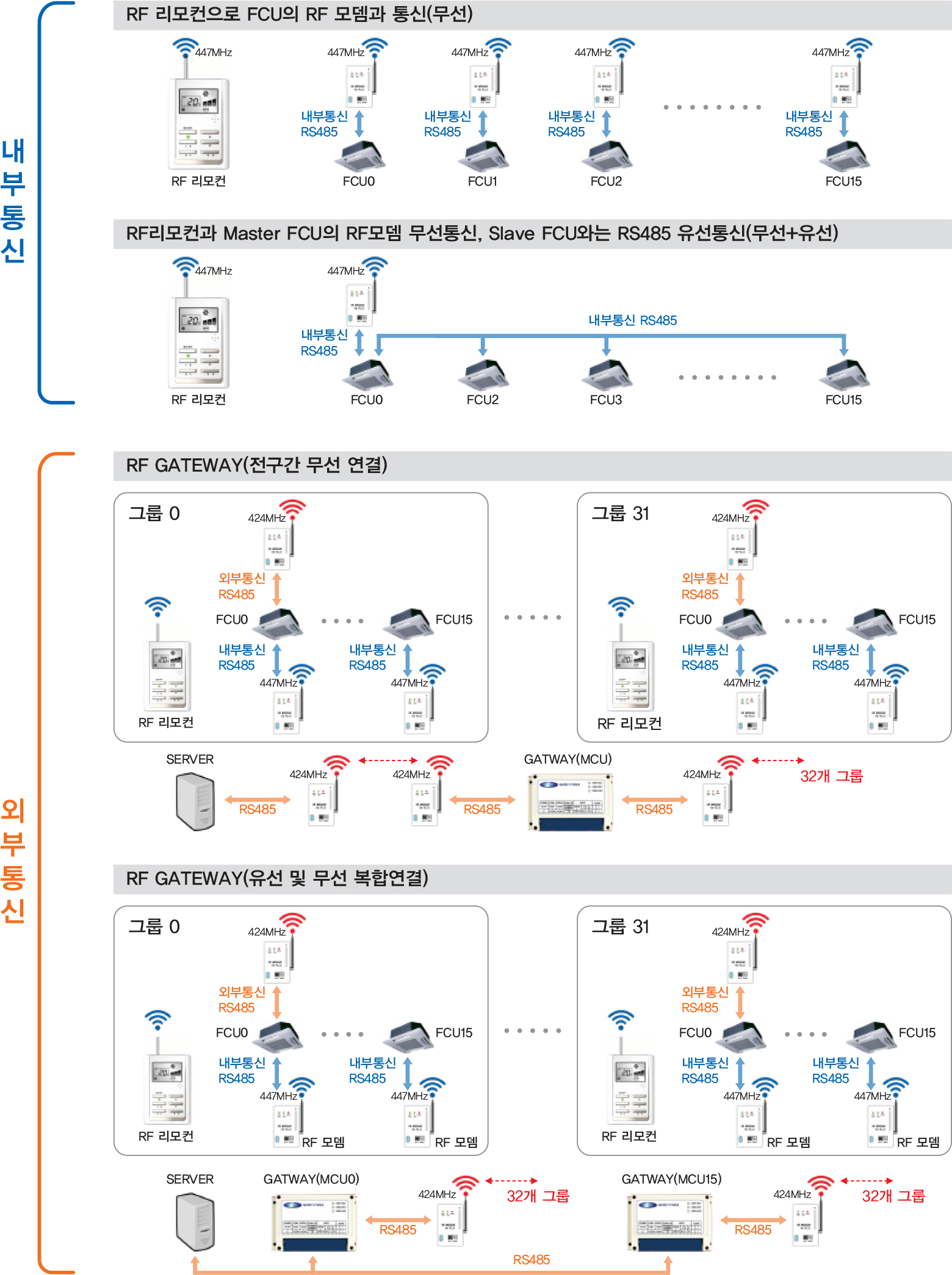 ①팬코일 유니트를 개별로 제어하거나 그룹으로 제어할 경우 유선 RS485 통신의 경우 제품까지 통신선로를 연결하여야 하지만, RF 무선 통신은 통신 선로의 연결이 불필요함.