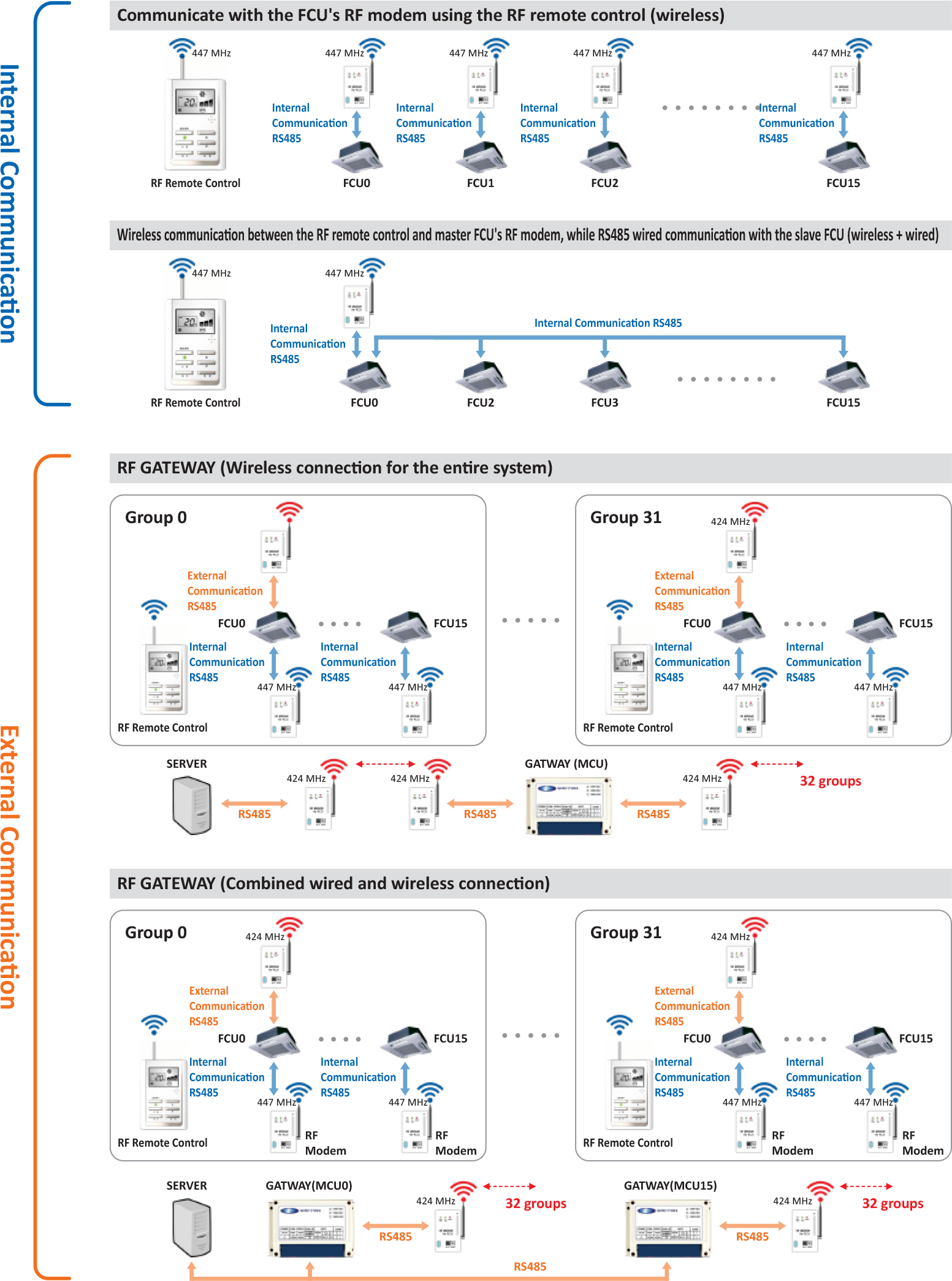 ①When controlling fan coil units (FCU) individually or as a group, wired RS485 communication requires the connection of ommunication lines o the products. However, RF wireless communication does not require the connection of ommunication lines