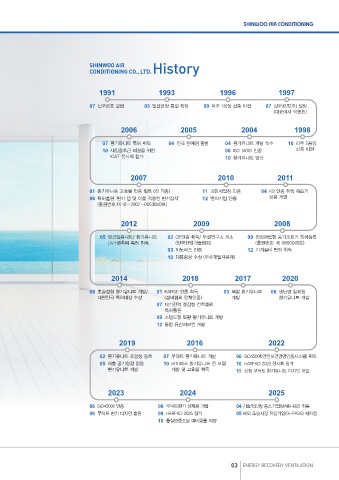 05 팬코일유니트/ 환기유니트 02 CE인증 획득/ 부설연구소 개소 09 천장매립형 공기조화기 특허등록
