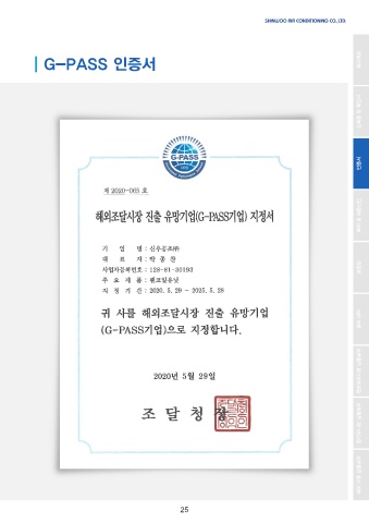 G-PASS 인증서 G-PASS 인증서 회사개요 등록증 및 확인서 인증서 특허 및 실용신안 표창장 설비 내역 팬코일유니트 납품실적 환기유니트 납품실적 해외 수출 납품실적 25
