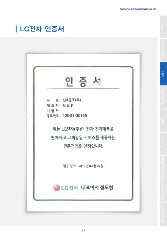 LG전자 인증서 LG전자 인증서 회사개요 등록증 및 확인서 인증서 특허 및 실용신안 표창장 설비 내역 팬코일유니트 납품실적 환기유니트 납품실적 해외 수출 납품실적 27