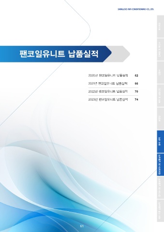 회사개요 등록증 및 확인서 팬코일유니트 납품실적 인증서 2020년 팬코일유니트 납품실적 62 2021년 팬코일유니트 납품실적 66 특허 및 실용신안 2022년 팬코일유니트 납품실적 70 2023년 팬코일유니트 납품실적 74 표창장 설비 내역 팬코일유니트 납품실적 환기유니트 납품실적 해외 수출 납품실적 61