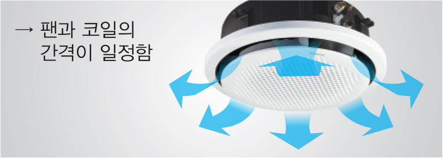 공기의 토출방향이 360°로 사각지대가 없이 공기의 흐름이 균일하게 분포되어 냉난방이 원활합니다.