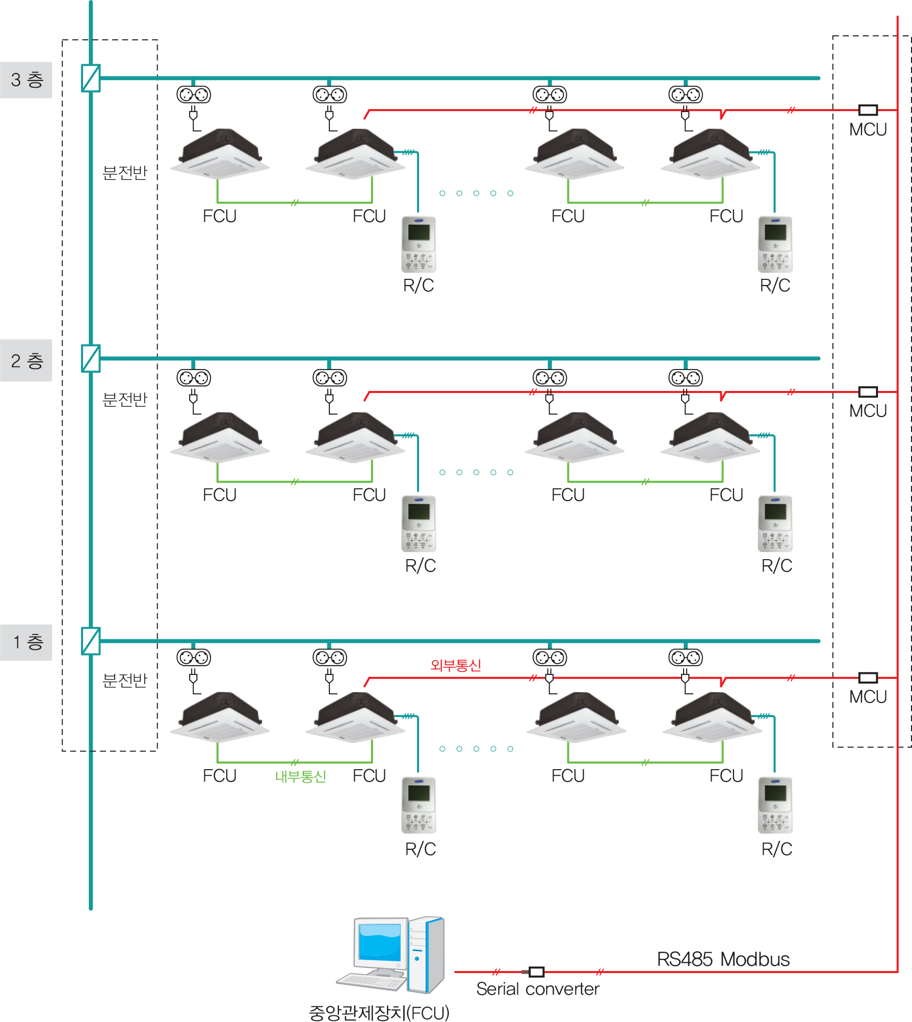 별도의 통신 선로 작업 필요 없음 FCU전원 선에 통신관련 네트워크 장비를 설치 하여야함 |